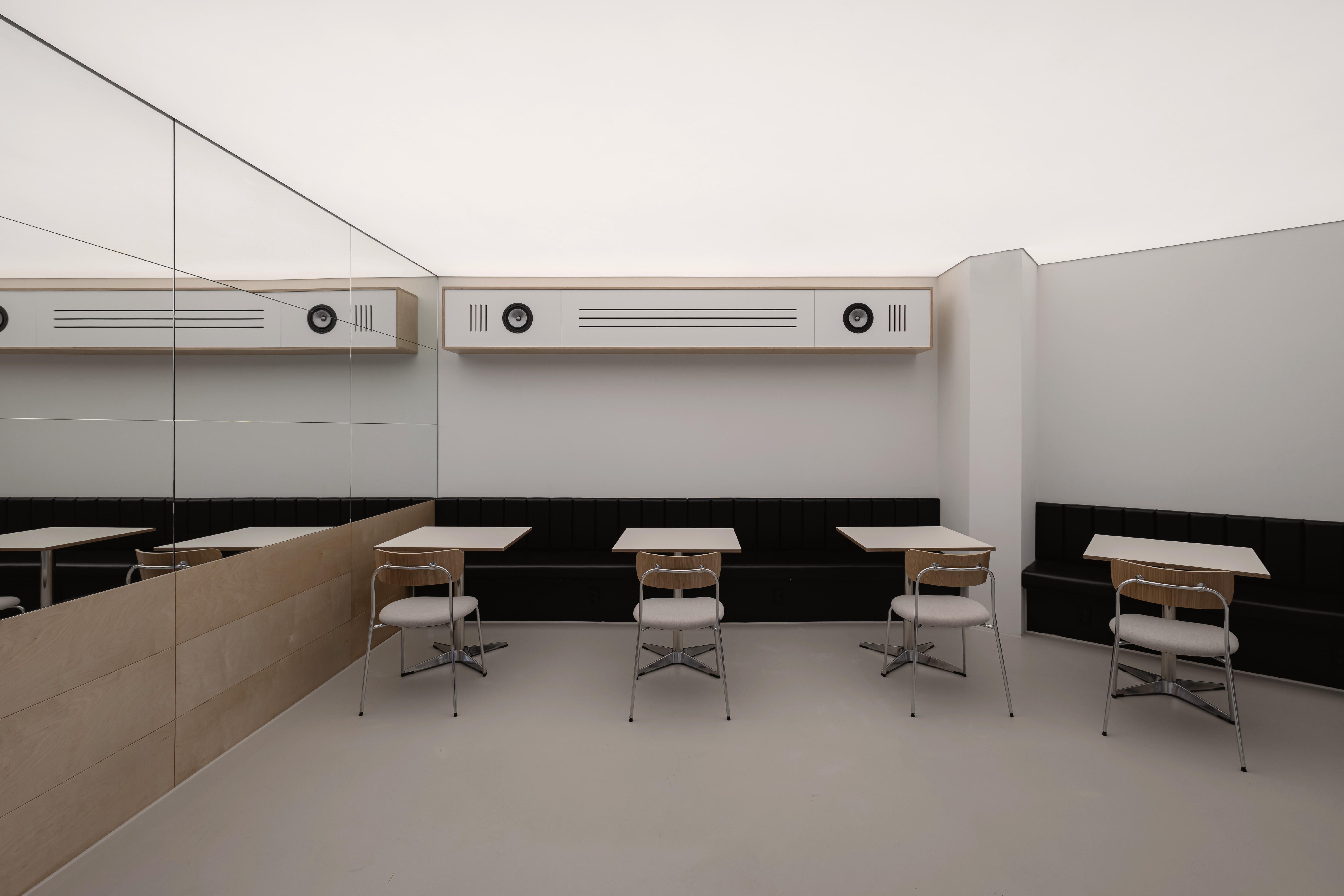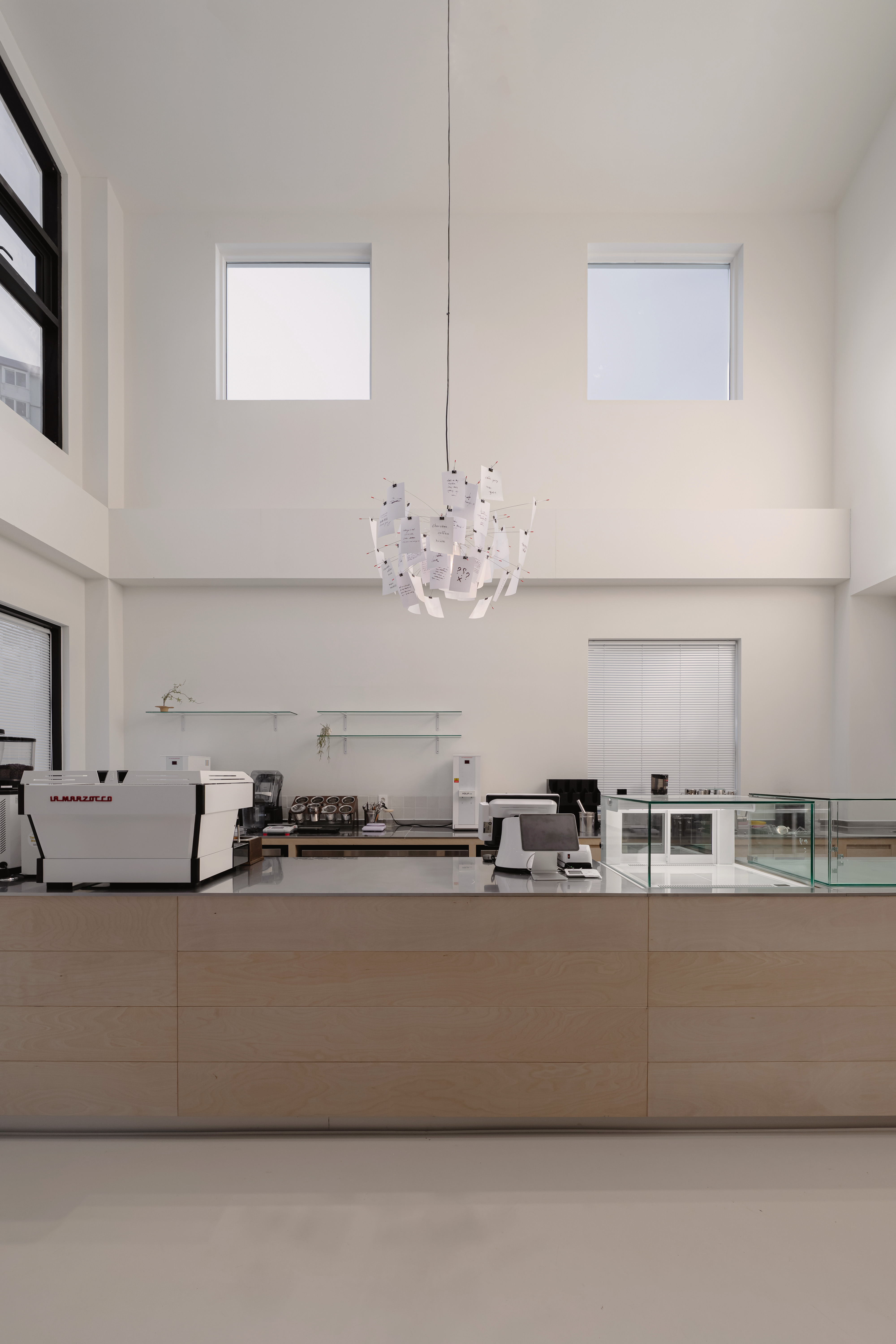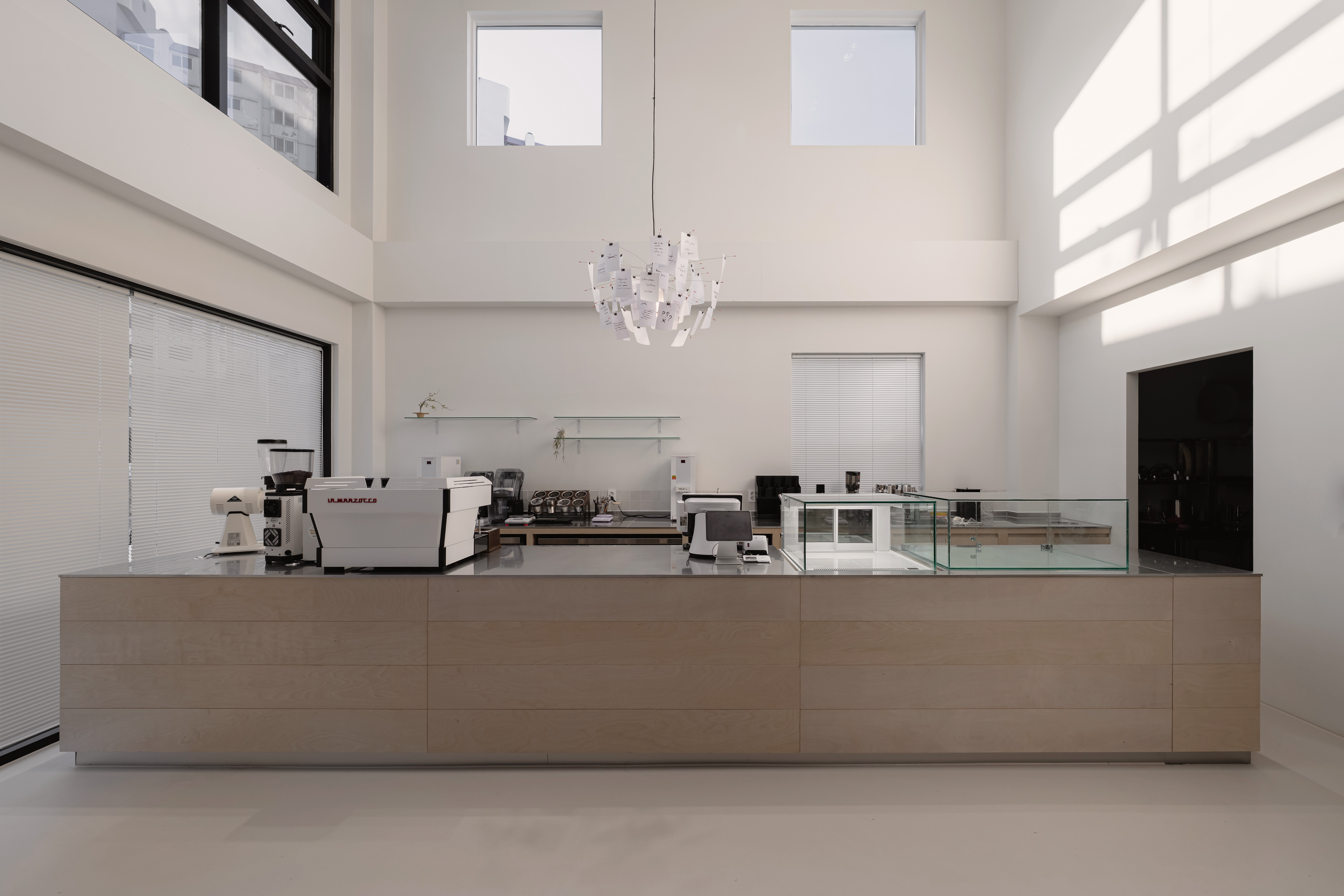 This space, where a high ceiling meets a refined white palette, is designed to go beyond a simple café and focus on the true essence of coffee. A composition stripped of excessive decoration draws natural light deep into the interior, while the changing qualities of light throughout the day complete the space as a living scene. At the center, a long bar acts as the core axis, balancing function and aesthetics. Warm wood textures, transparent glass, and precise coffee equipment come together in harmony, turning even the barista’s movements into a performance. By eliminating unnecessary elements, the experience of focusing on a single cup of coffee becomes clearer and more intentional.
